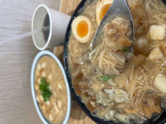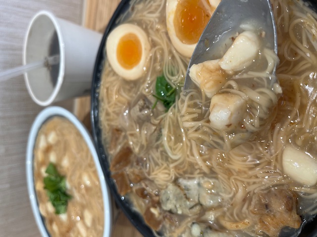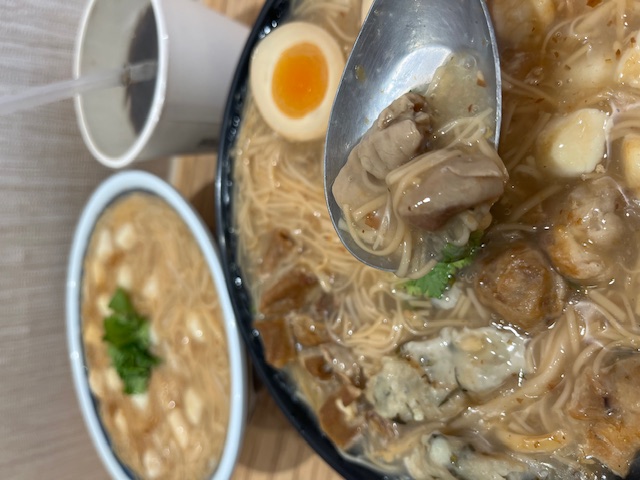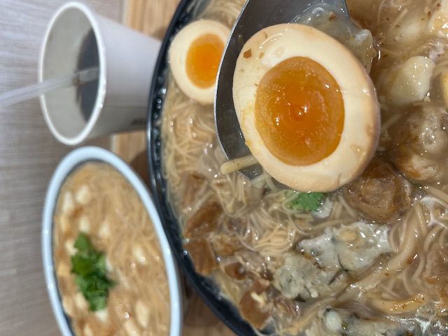 滿溢特盛的料十分豐富,干貝、腸仔、雞肉羹、虱目魚羹、滿漢全席,還有一顆切半的溏心蛋,一般外面的賣的麵線配料,在這一碗幾乎都看得到,想要什麼配料都吃得到的話,可以點滿溢特盛
