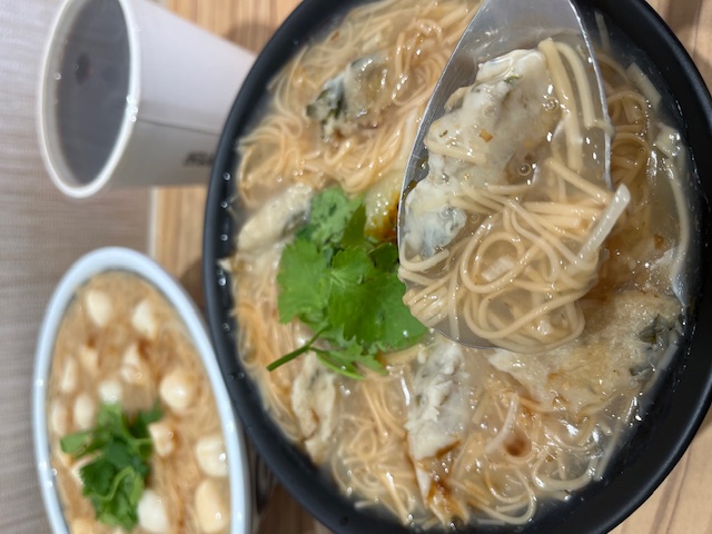 魚羹麵線堅持使用手工製作,內容包含九層塔加上虱目魚,每一塊的魚羹都十分扎實