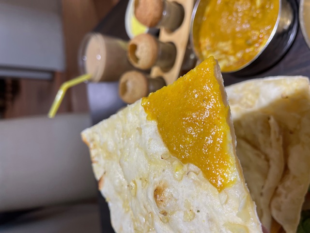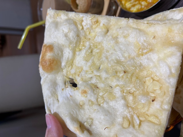 米飯跟烤餅可以搭配咖哩,印度蒜味烤餅上滿滿的蒜末舖滿整個烤餅,烤餅散發出濃郁的蒜香味,表面微酥內部蓬鬆柔軟還帶一點嚼勁,搭配上北印度鮮魚咖哩醬料,一下子就把烤餅吃完