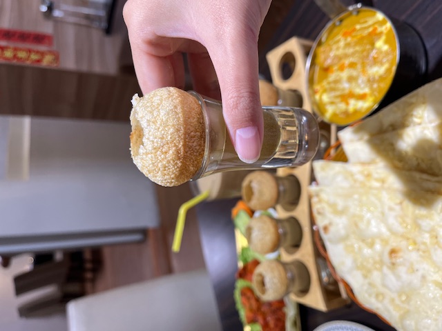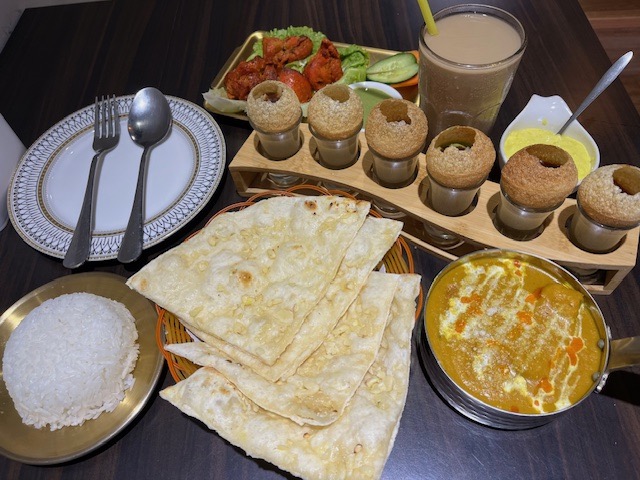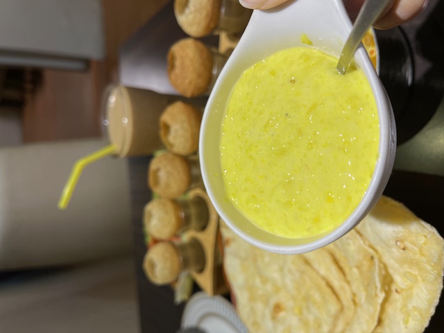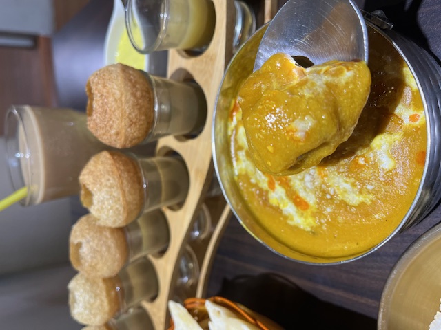 印度水醬酥脆球是印度街頭常見的小吃,裡頭有馬鈴薯泥蔬菜印度香料,倒入底下的水醬一口吃下去,外皮酥脆加上中間的香料香氣,帶有強烈的香料香氣和薄荷的清新感,吃起來非常涮嘴