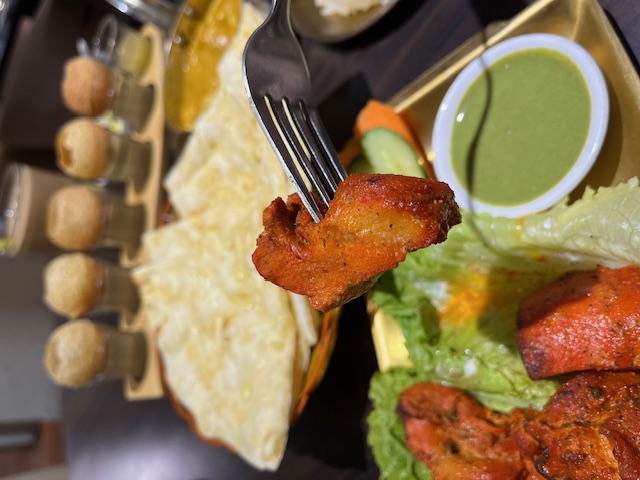 坦都炭烤香料雞肉,厚實的去骨雞肉搭配上優格、印度香料,一旁還有附上香菜綠醬,很適合配上一口白飯或是包在烤餅裡