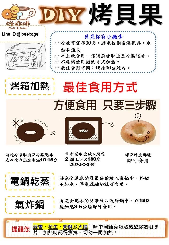外酥內軟的貝果,店內貝果的供應商是擁有SGS認證的廠商,讓每個消費者都能吃的安心,若喜歡的話也有提供購買冷凍貝果的服務,讓早餐更加健康跟方便,三種加熱方式快速解決一餐,可以自己自行加蛋加醬,做成自己要的口味