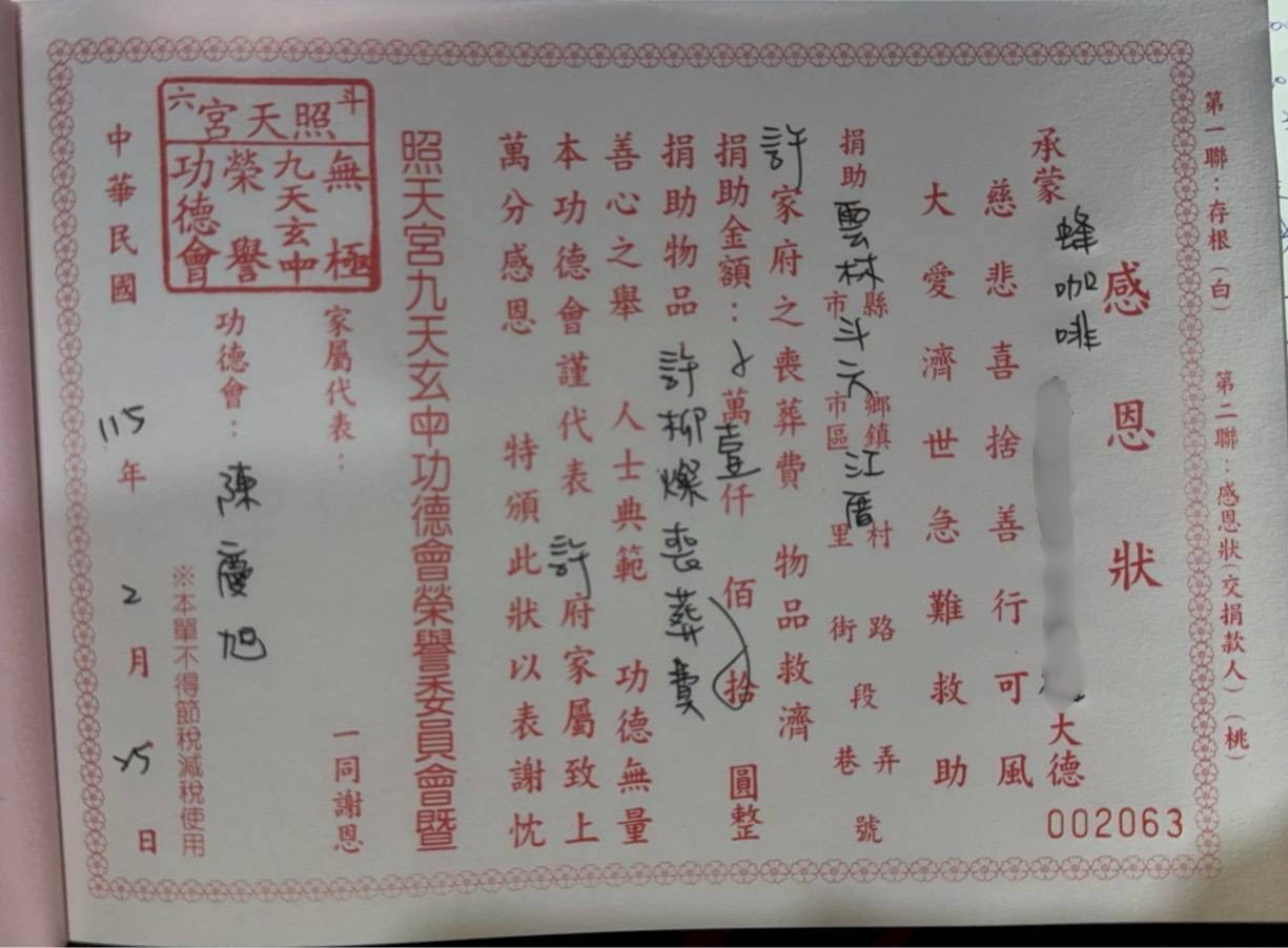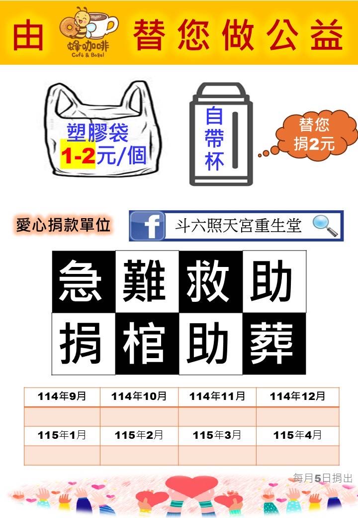 蜂咖啡的老闆娘人美心善,鼓勵大家一起做公益,若消費者自備環保袋或自帶杯(環保袋兩元自帶杯五元),就捐贈至斗六照天宮重生堂