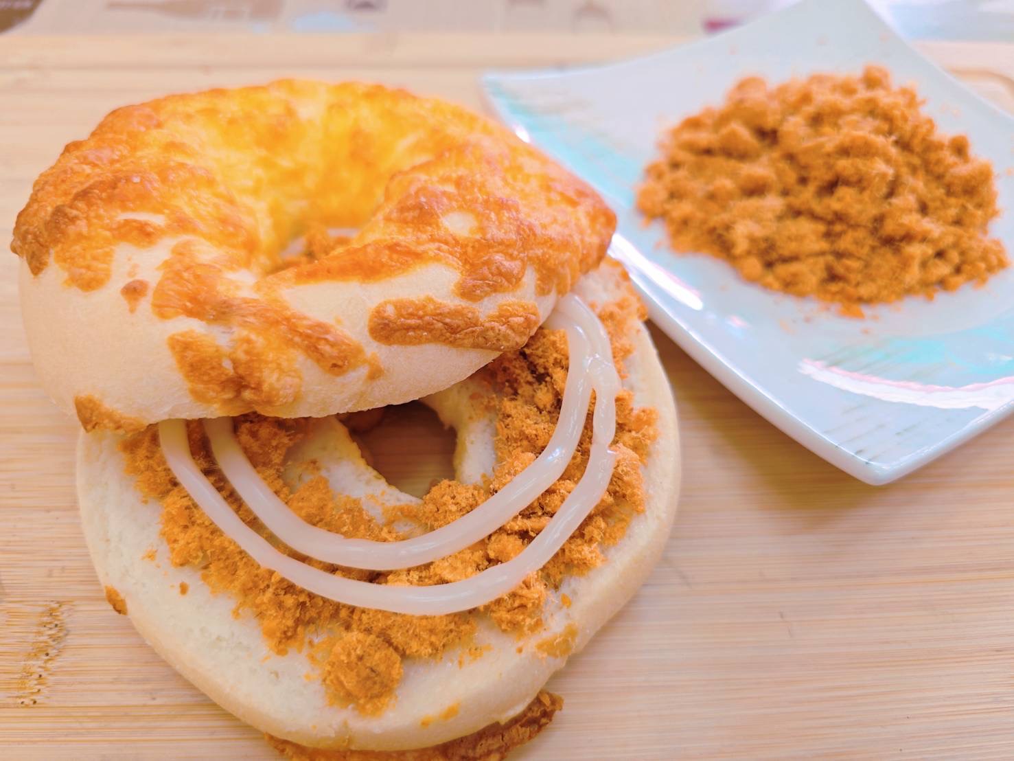 肉鬆沙拉是鹹甜的滋味,濃郁的肉鬆香氣搭配上甜甜的美乃滋,鹹甜交織、層次豐富