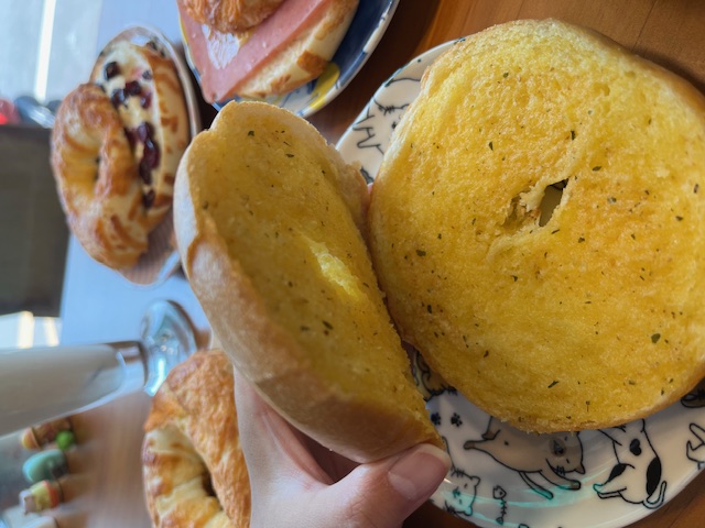 香蒜口味是中山醫學大學最受學生歡迎的口味,濃郁的蒜香味撲鼻而來,而且香蒜內餡不只有塗一面,貝果兩面都有香蒜醬,誠意滿滿