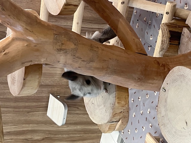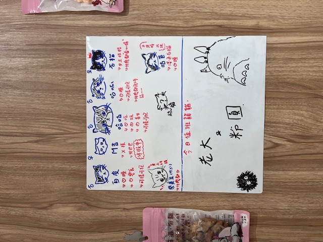 屋內有個白板寫著今日的寵物值日生,方便辨認貓咪,今日的貓咪有一隻叫做石榴的很親人,等待餐點的時候,也可以跟貓咪們互動